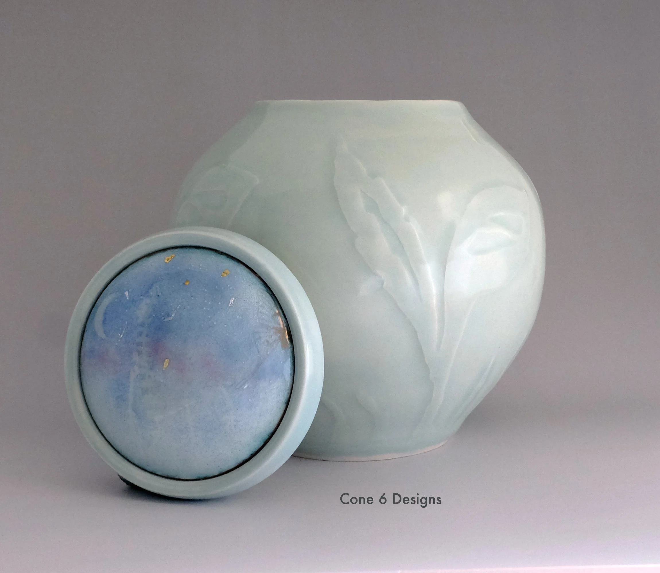 Tall Green Porcelain Urn with Abstract Enamel Lid